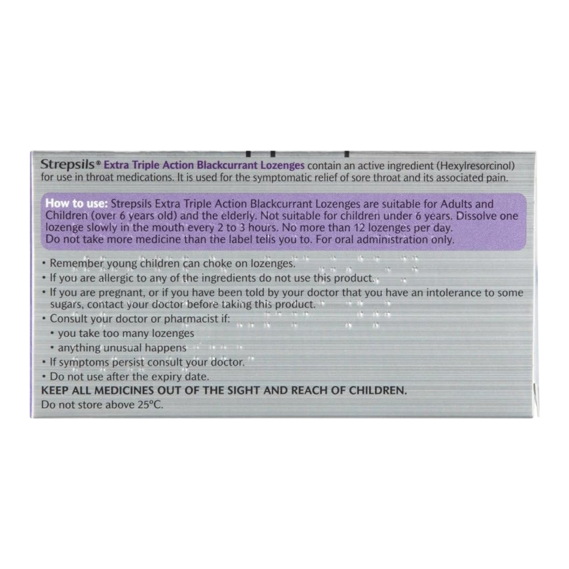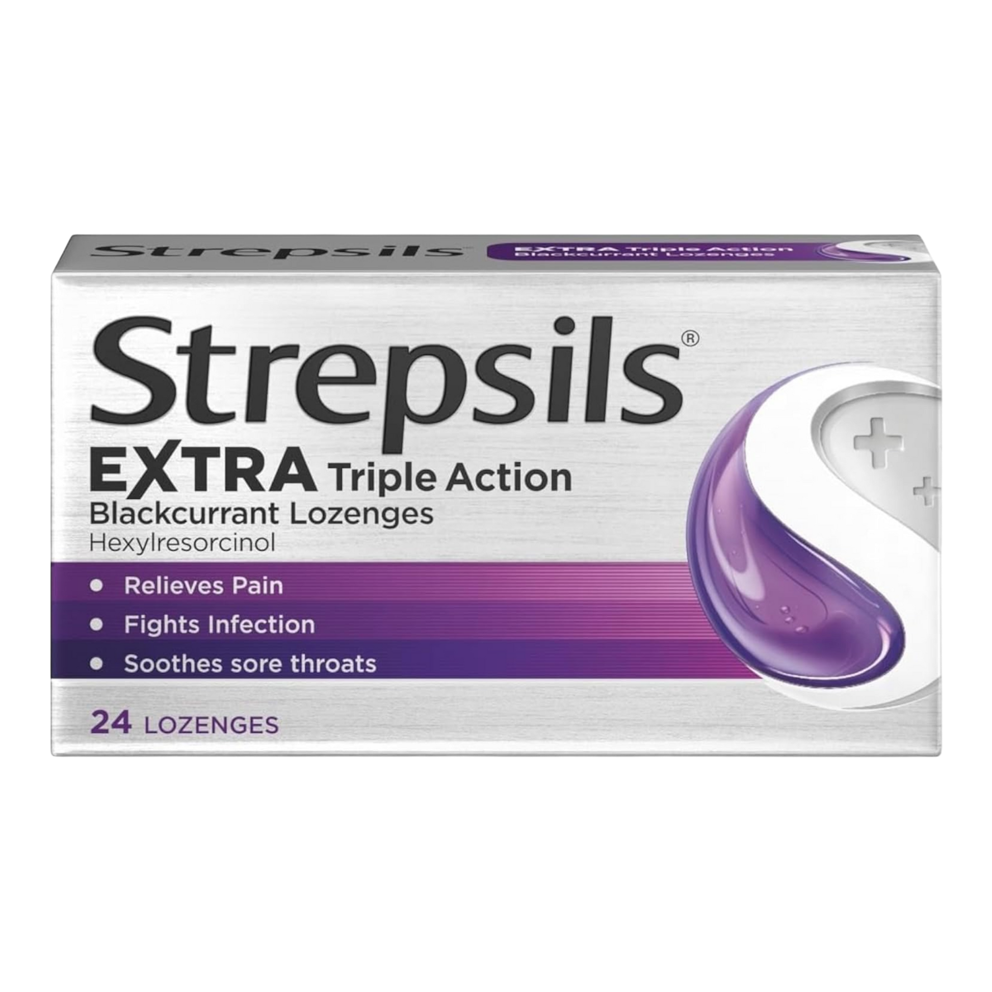 Soothe your sore throat with Strepsils Extra. These triple-action blackcurrant lozenges provide powerful relief from sore throat pain, irritation, and discomfort. The fast-acting formula contains an active anesthetic to numb throat pain, an antiseptic to kill bacteria, and a soothing base to keep your throat comfortable and hydrated.
